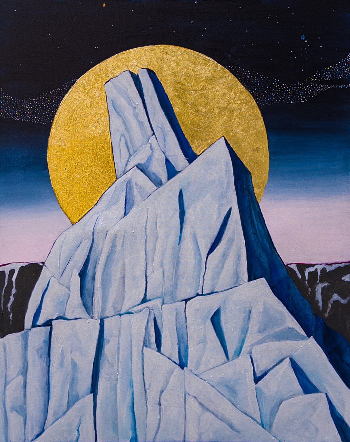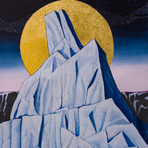 Modern Martyrs was inspired by the iconography of Eastern Orthodoxy. The solemn saints who suffered and died, and are now immortalized as rigid forms against symbolic dark backgrounds with precious gold and silver leaf halos. To my mind icebergs have become a modern equivalent, victims of the Anthropocene. Our greed and selfishness is destroying the great ice both north and south. Once calved these icebergs survive just a few years before completely dissolving into the sea. In the meantime they are majestic reminders of what we are losing.